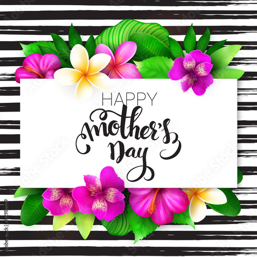 Vector Mothers Day Greetings Card With Hand Lettering Happy Mothers Day With Tropical Flowers Alstroemeria Plumeria Hibiscus And Leaves On Watercolor Striped Background Stock Vector Adobe Stock