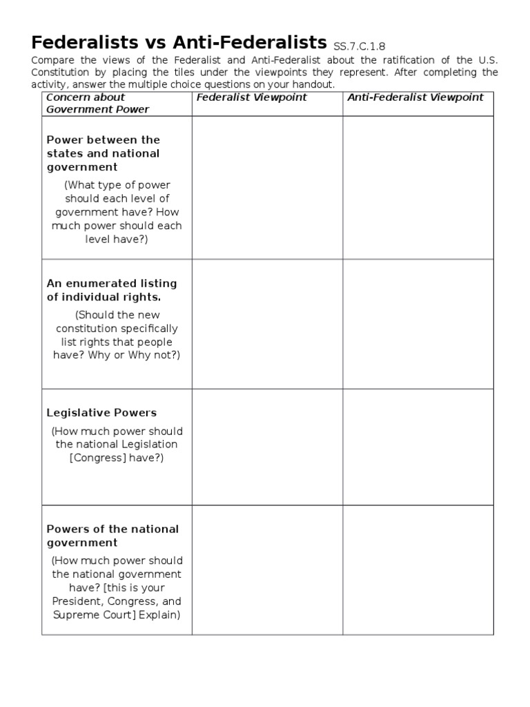 Federalists Vs Anti Federalists Identification Worksheet And Answer Key
